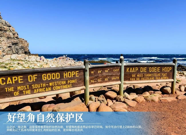 【好望角】于開普半島南端,在保護區(qū)內(nèi),鐵銹色凹凸不平的地面上生長著一片片低矮的灌木叢和被稱為南非國花的山龍眼,狒狒、非洲旋角大羚羊等動物間或在眼前一躍而過。在大西洋邊紅色的卵石灘上,時常可見駝鳥閑庭信步的可愛模樣。在保護區(qū)的西南端有一個如同伸入大西洋中巨大鱷魚爪的岬角。