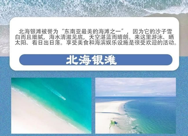 北海銀灘被譽(yù)為“東南亞最美的海灘之一 ”因?yàn)樗纳匙友┌锥壹?xì)膩,海水清 澈見底,天空湛藍(lán)而晴朗。來這里游泳、曬太陽、看日出日落。享受美食和海濱 娛樂設(shè)施是很受歡迎的活動(dòng)