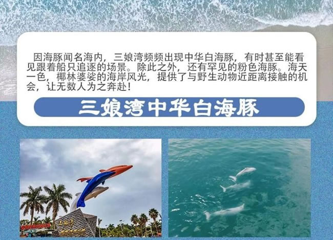 因海豚聞名海內(nèi),三娘灣頻頻出現(xiàn)中華白海豚,有時(shí)甚至能看見跟著船只追逐的 場景。除此之外,還有罕見的粉色海豚。海天椰林婆娑的海岸風(fēng)光,提供了與野 生動(dòng)物近距離接觸的機(jī) ·備讓無數(shù)人為之奔赴!
